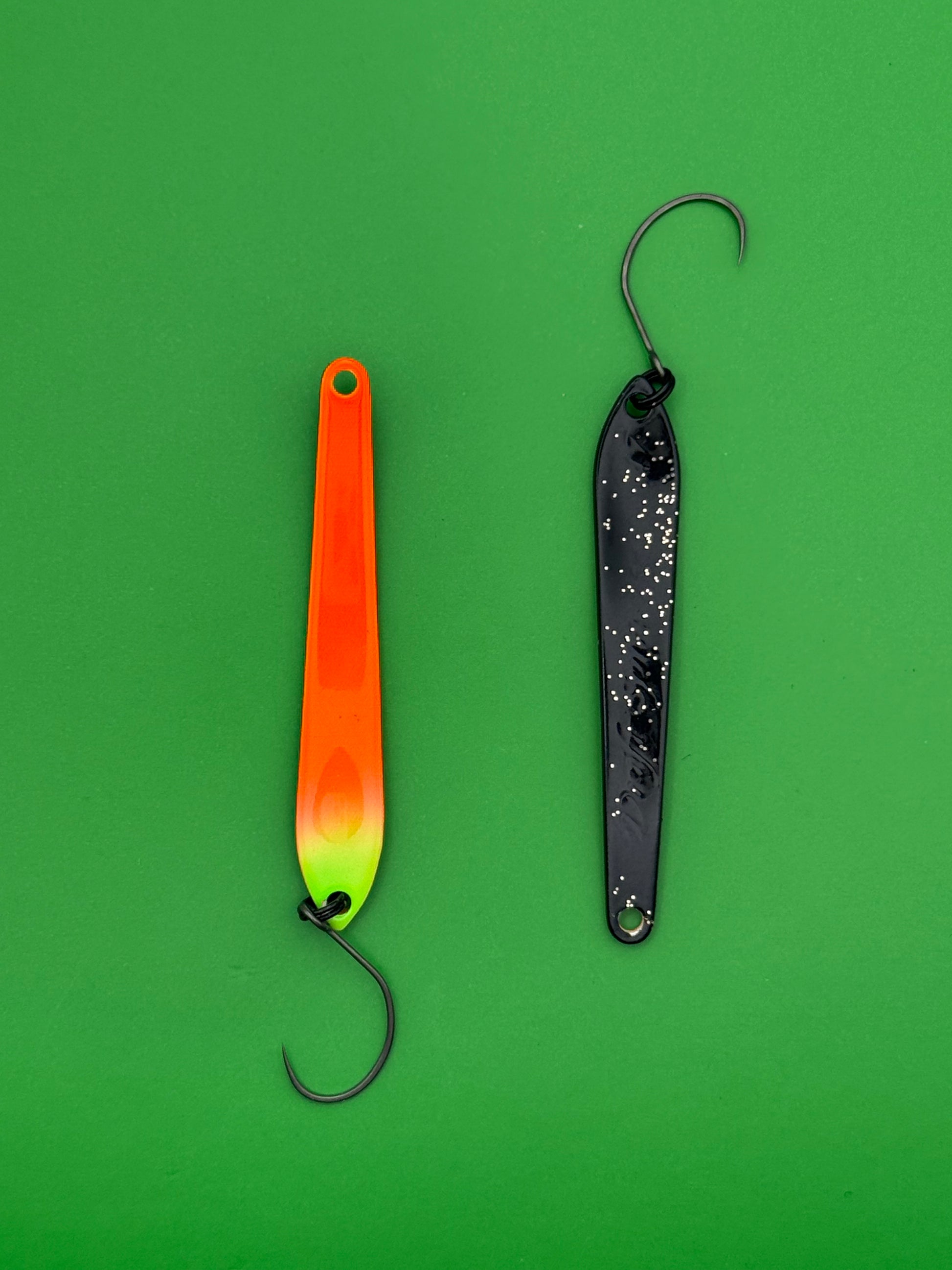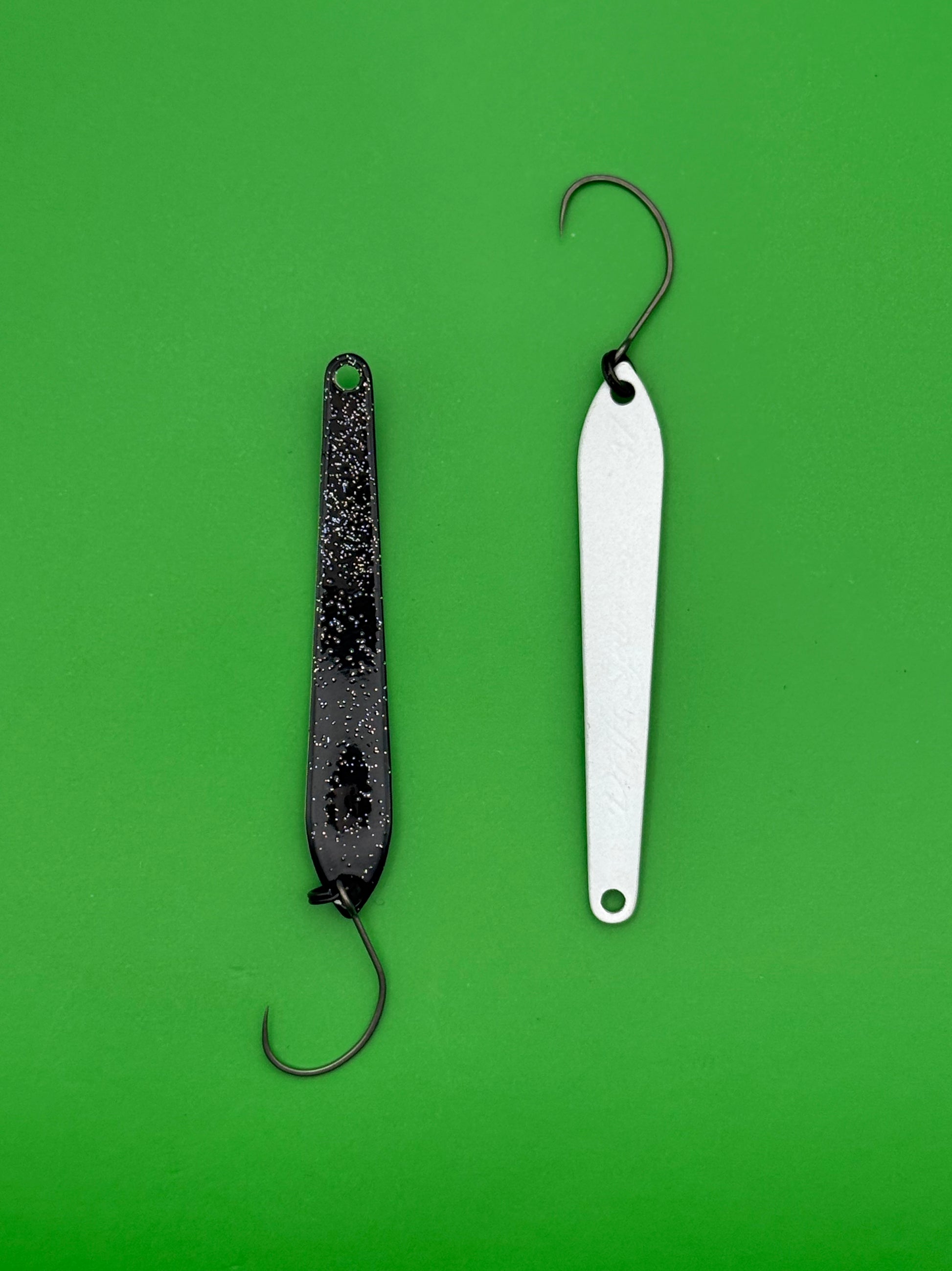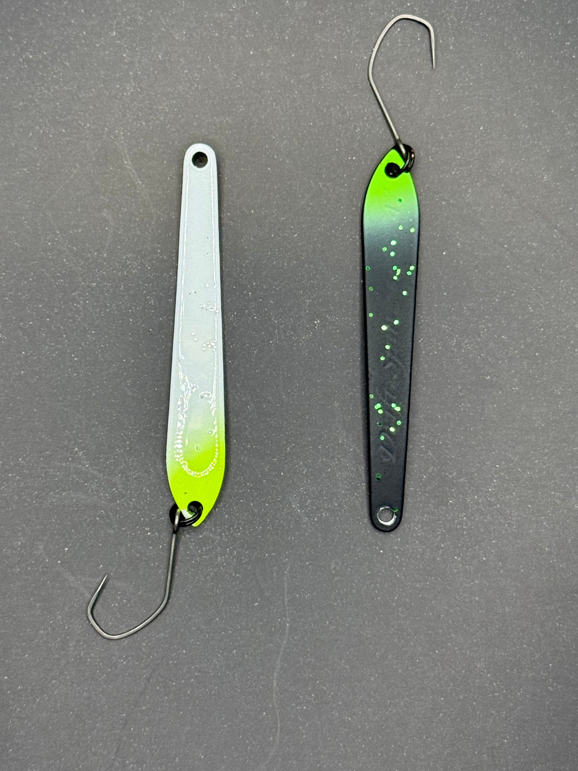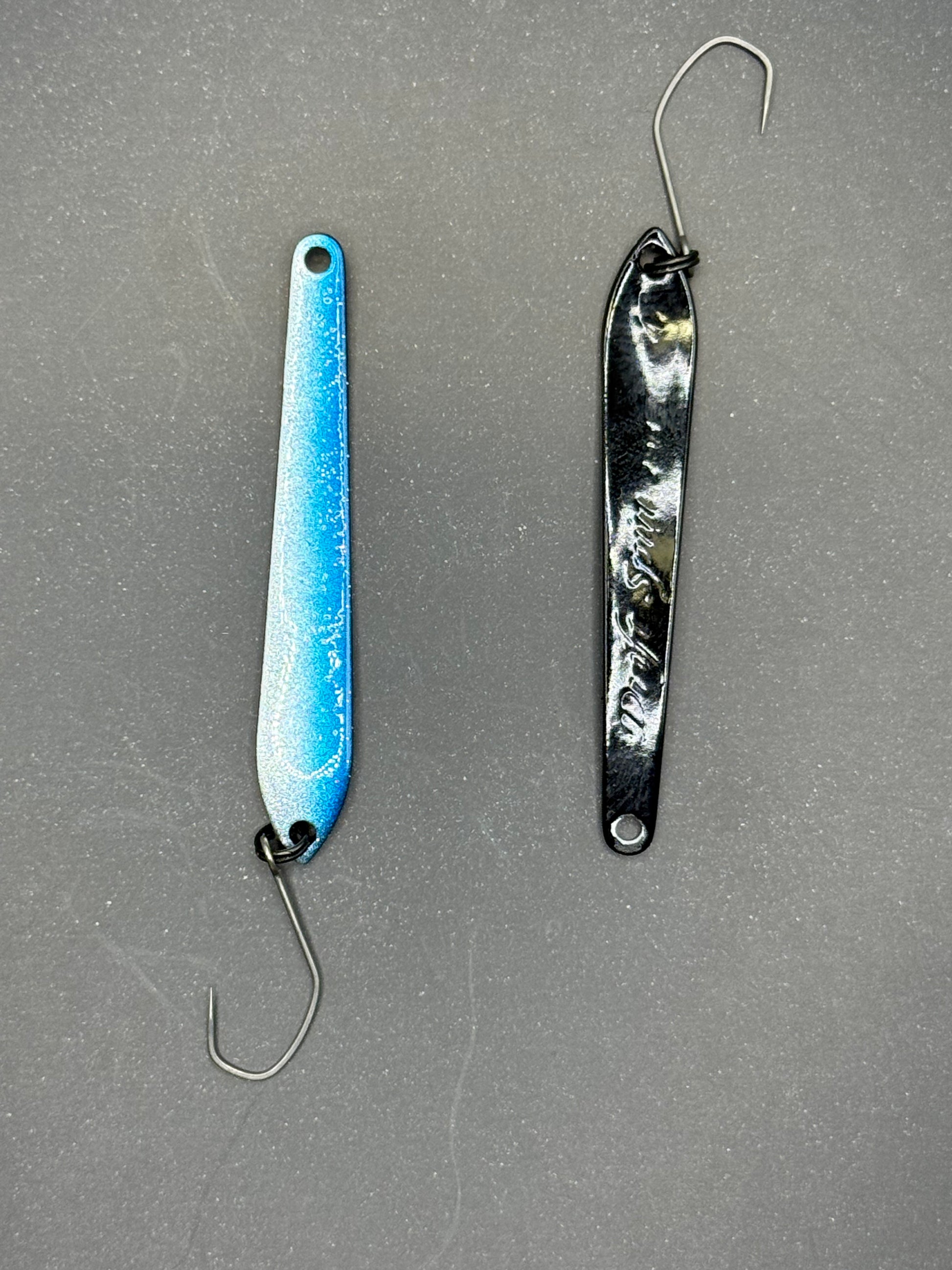 DS Spoon 2,5 g (47 mm) – et unikt blink med smalt design og stabil gang. Skaber lette vibrationer uden kraftig wobbling og trigger effektivt selv passiv ørred. Fungerer bedst ved langsom indspinning med korte pauser.