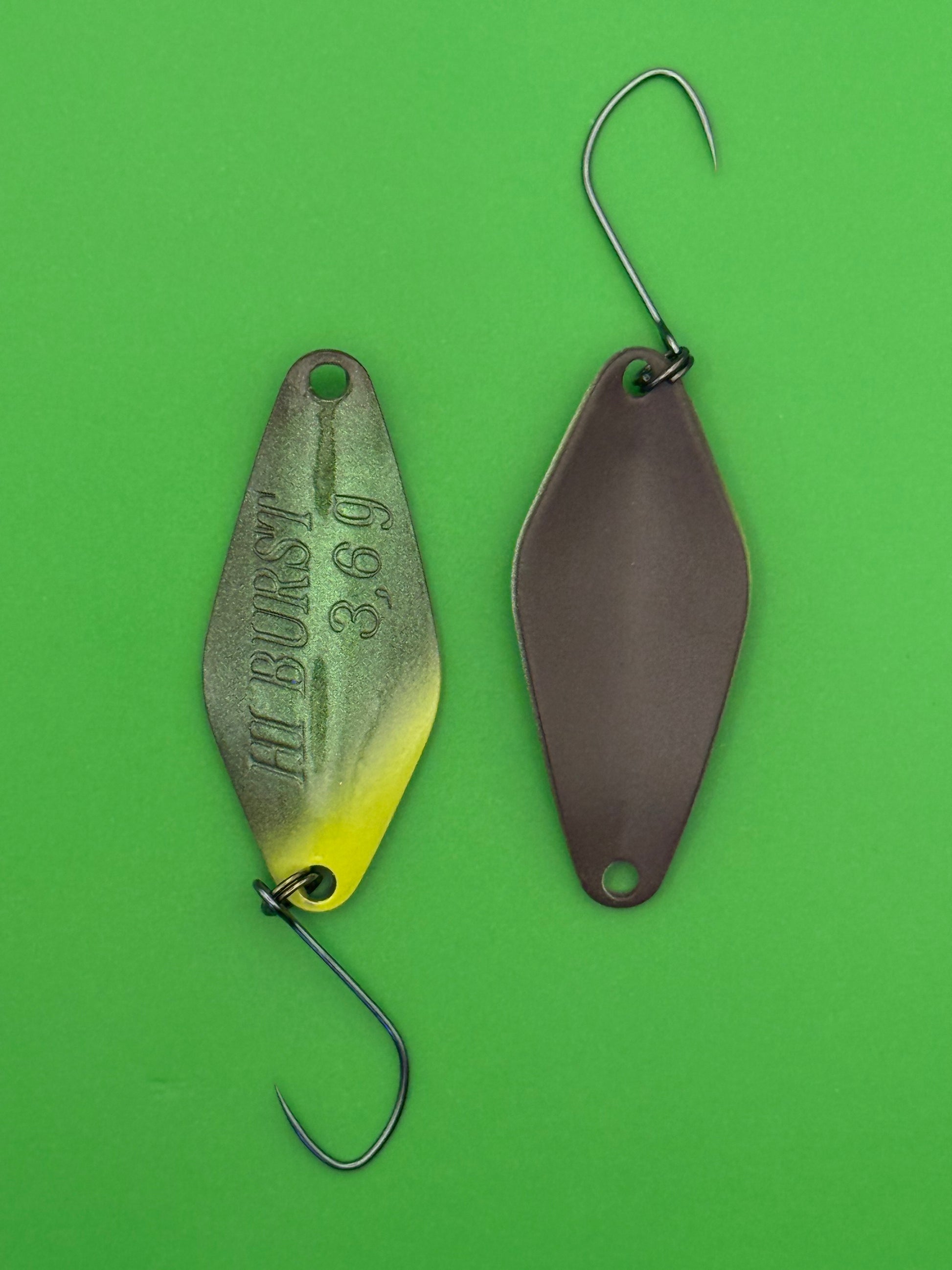 Hi Burst 3,6 g fungerer bedst ved jævn indspinning i moderat tempo. Korte pauser eller små ryk kan også anvendes for at trigge passiv ørred. På grund af vægten kaster blinket langt og stabilt – selv i modvind – hvilket gør det muligt at nå fjerne zoner i søen.